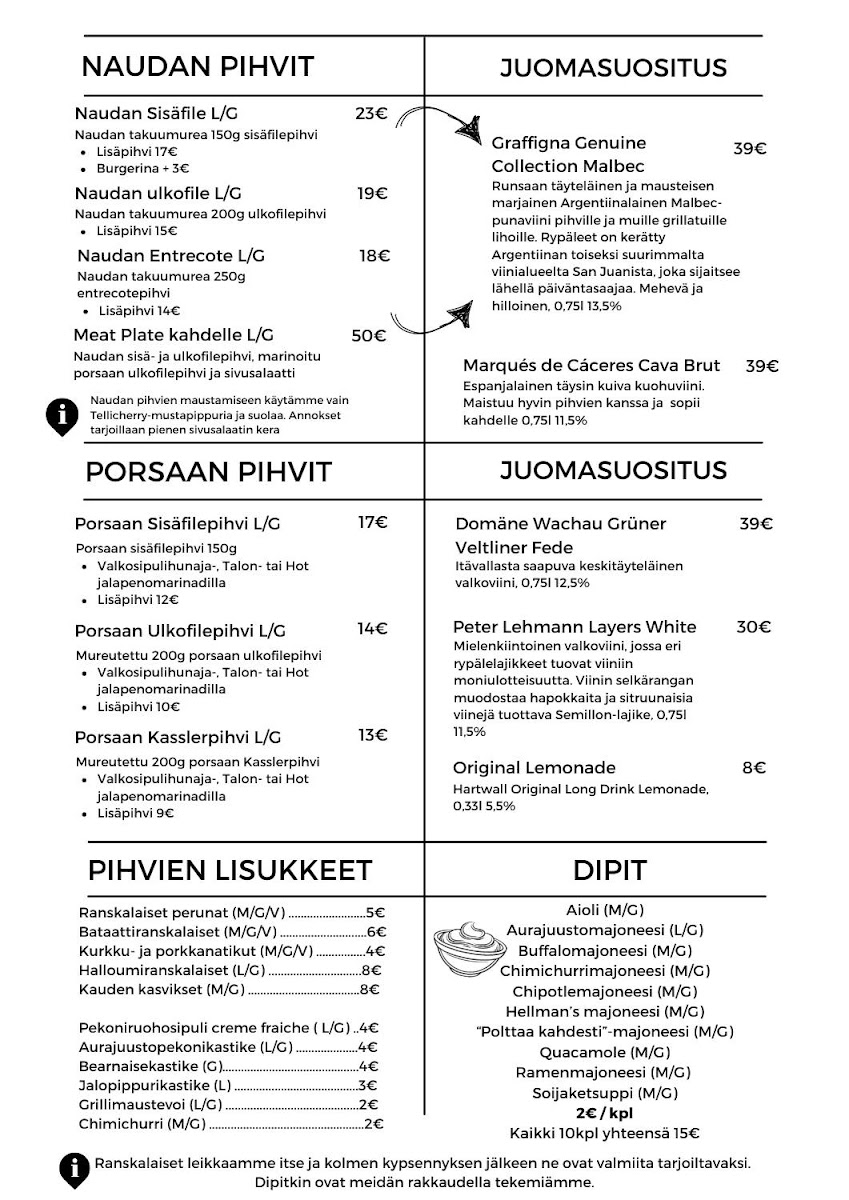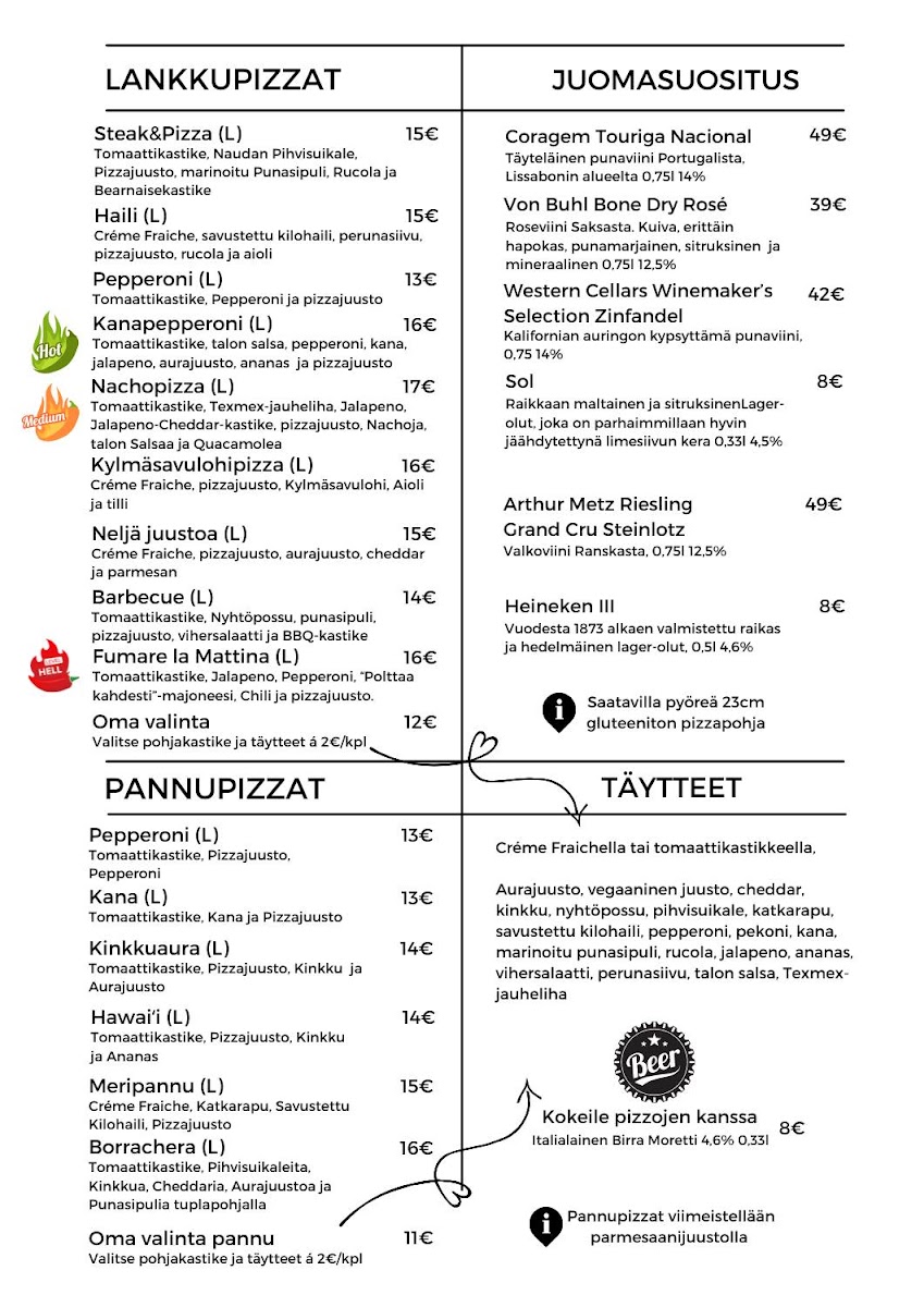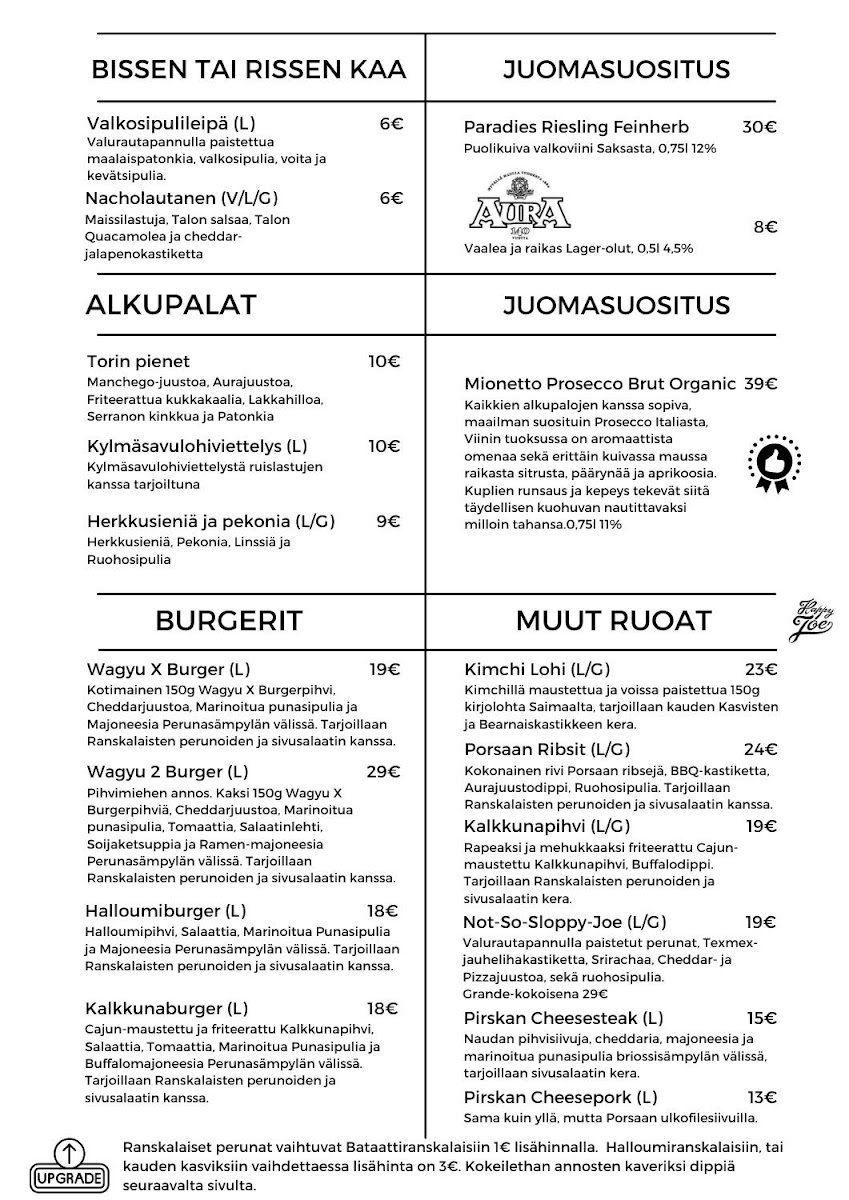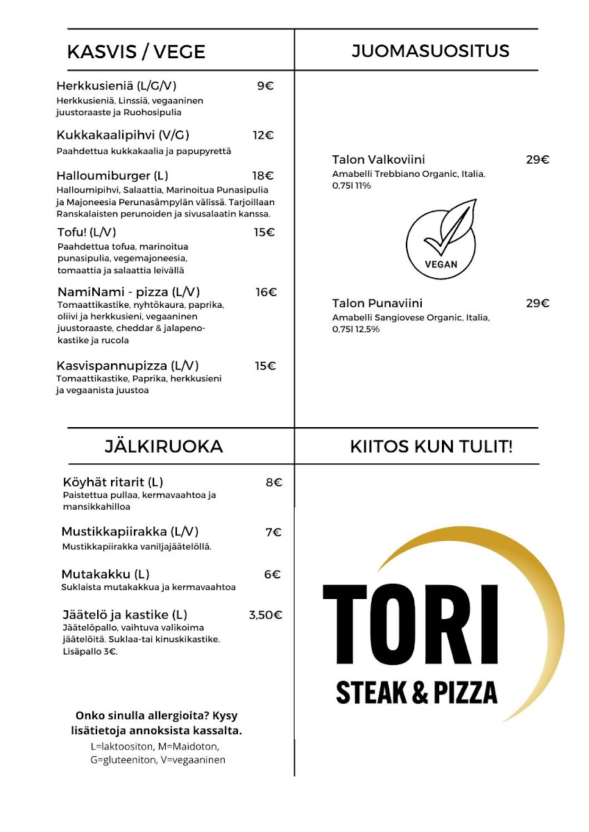 Overall, the menu at Tori Steak & Pizza offers a concise yet appealing selection that balances casual comfort food with a touch of indulgence. The “Bissen tai Rissen kaa” section features shareable starters like Valkosipulileipä and Nacholautanen, setting a relaxed tone, while the appetizers elevate things slightly with options such as Torin pienet, Kylmäsavulohiviettelys, and Herkkusieniä ja pekonia, each suggesting rich, savory flavors. Moving into the mains, the variety continues with satisfying choices like the premium-sounding Waguy X Burger, the vegetarian-friendly Halloumiburger, and heartier dishes including Puolikas broileri and Pirskan Cheesesteak. Although specific prices are not listed, the menu composition gives the impression of a well-rounded offering that caters to different tastes, from light bites to filling, meat-focused meals, making it a solid choice for both casual dining and more indulgent cravings.